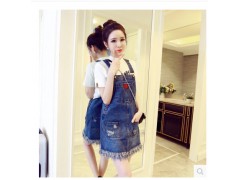 品质春季新款女装韩版洗水牛仔背带裙 时尚潮流流苏A字连衣裙短裙